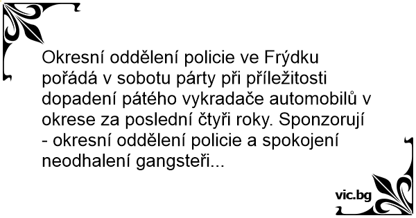 Okresní oddělení policie ve Frýdku pořádá v sobotu párty při příležitosti dopadení pátého vykradače automobilů v okrese za poslední čtyři roky. Sponzorují - okresní oddělení policie a spokojení neodhalení gangsteři...