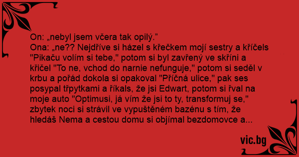 Ona: „ne?? Nejdříve si házel s křečkem mojí sestry a kříčels "Pikaču volím si tebe," potom si byl zavřený ve skříni a křičel "To ne, vchod do narnie nefunguje," potom si seděl v krbu a pořád dokola si opakoval "Příčná ulice," pak ses posypal třpytkami a říkals, že jsi Edwart, potom si řval na moje auto "Optimusi, já vím že jsi to ty, transformuj se," zbytek noci si strávil ve vypuštěném bazénu s tím, že hledáš Nema a cestou domu si objímal bezdomovce a říkals "Brumbále, ty žiješ."”