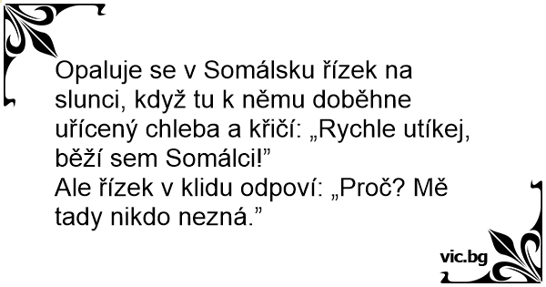 Opaluje se v Somálsku řízek na slunci, když tu k němu doběhne uřícený chleba a křičí: „Rychle utíkej, běží sem Somálci!”