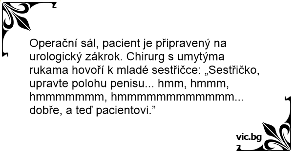 Operační sál, pacient je připravený na urologický zákrok. Chirurg s umytýma rukama hovoří k mladé sestřičce: „Sestřičko, upravte polohu penisu... hmm, hmmm, hmmmmmmm, hmmmmmmmmmmmm... dobře, a teď pacientovi.”