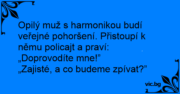 Opilý muž s harmonikou budí veřejné pohoršení. Přistoupí k němu policajt a praví: „Doprovodíte mne!”