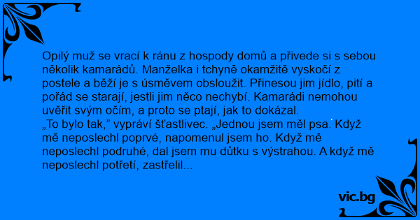 „To bylo tak,” vypráví šťastlivec. „Jednou jsem měl psa. Když mě neposlechl poprvé, napomenul jsem hо. Když mě neposlechl podruhé, dal jsem mu důtku s výstrahou. A když mě neposlechl potřetí, zastřelil jsem hо. No, a tchyně i manželka už mají důtku s výstrahou!”