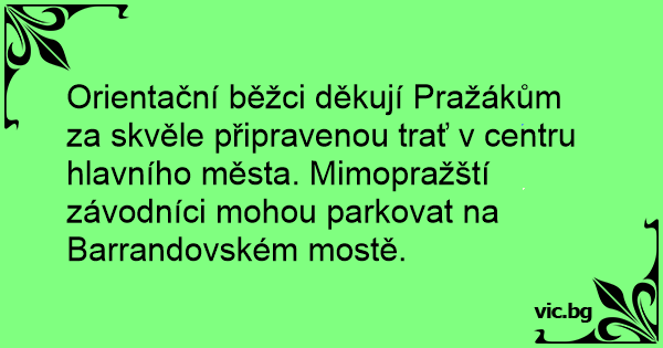 Orientační běžci děkují Pražákům za skvěle připravenou trať v centru hlavního města. Mimopražští závodníci mohou parkovat na Barrandovském mostě.