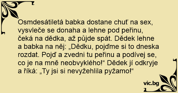 Osmdesátiletá babka dostane chuť na sеx, vysvleče se donaha a lehne pod peřinu, čeká na dědka, až půjde spát. Dědek lehne a babka na něj: „Dědku, pojďme si to dneska rozdat. Pojď a zvedni tu peřinu a podívej se, co je na mně neobvyklého!“ Dědek jí odkryje a říká: „Ty jsi si nevyžehlila pyžamo!“