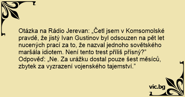 Otázka na Rádio Jerevan: „Četl jsem v Komsomolské pravdě, že jistý Ivan Gustinov byl odsouzen na pět let nucených prací za to, že nazval jednoho sovětského maršála idiotem. Není tento trest příliš přísný?”