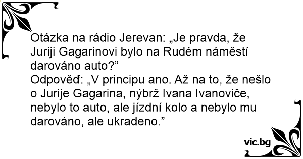Odpověď: „V principu ano. Až na to, že nešlo o Jurije Gagarina, nýbrž Ivana Ivanoviče, nebylo to auto, ale jízdní kolo a nebylo mu darováno, ale ukradeno.”