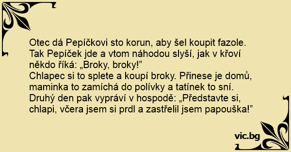 Otec dá Pepíčkovi sto korun, aby šel koupit fazole. Tak Pepíček jde a vtom náhodou slyší, jak v křoví někdo říká: „Broky, broky!”