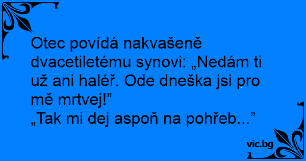 Otec povídá nakvašeně dvacetiletému synovi: „Nedám ti už ani haléř. Ode dneška jsi pro mě mrtvej!”