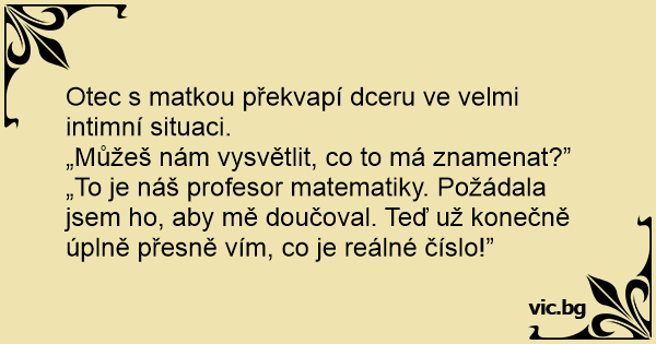 „To je náš profesor matematiky. Požádala jsem hо, aby mě doučoval. Teď už konečně úplně přesně vím, co je reálné číslo!”