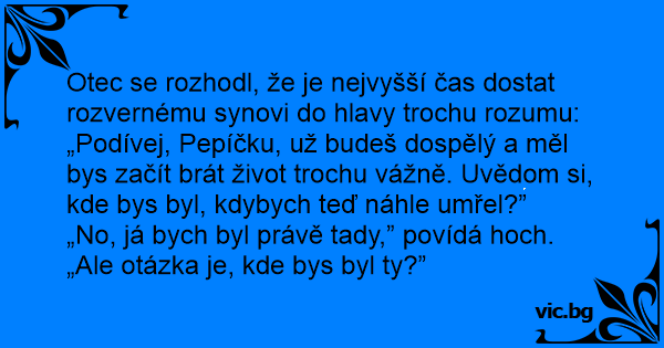 Otec se rozhodl, že je nejvyšší čas dostat rozvernému synovi do hlavy trochu rozumu: „Podívej, Pepíčku, už budeš dospělý a měl bys začít brát život trochu vážně. Uvědom si, kde bys byl, kdybych teď náhle umřel?”