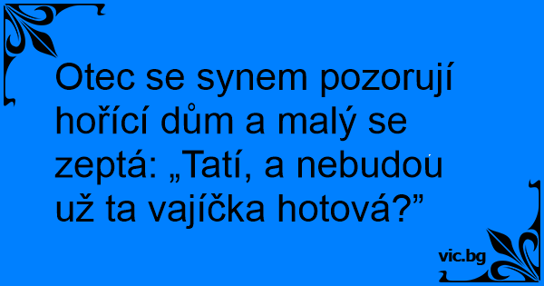 Otec se synem pozorují hořící dům a malý se zeptá: „Tatí, a nebudou už ta vajíčka hotová?”