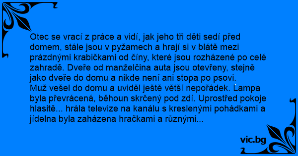 Muž rychle vyběhl schody, stoupajíce na další hračky a šlapajíce po oblečení. Ale nehleděl na to, jen hledal svou manželku. Bál se, že je nemocná, nebo se jí něco vážného stalo. Viděl jak dveřmi od koupelny prosakuje voda. Nakoukl tam a uviděl mokré ručníky na podlaze, rozlité mýdlo a další rozházené hračky. Kilometry toaletního papíru se vinuly mezi tím vším a zrcadlo i stěny byly pomalovány zubní pastou. Rychle se otočil a spěchal do ložnice, kde našel svou manželku, ležící v posteli a čtoucí knihu.