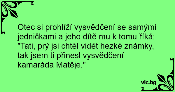 "Tati, prý jsi chtěl vidět hezké známky, tak jsem ti přinesl vysvědčení kamaráda Matěje."