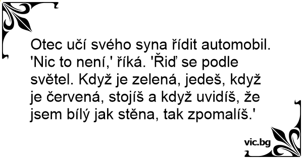 'Nic to není,' říká. 'Řiď se podle světel. Když je zelená, jedeš, když je červená, stojíš a když uvidíš, že jsem bílý jak stěna, tak zpomalíš.'