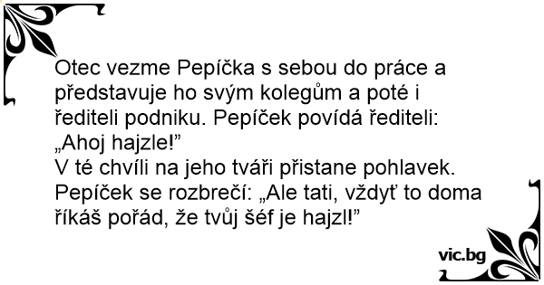 V té chvíli na jeho tváři přistane pohlavek. Pepíček se rozbrečí: „Ale tati, vždyť to doma říkáš pořád, že tvůj šéf je hajzl!”