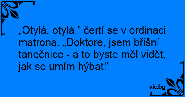 „Otylá, otylá,” čertí se v ordinaci matrona. „Doktore, jsem břišní tanečnice - a to byste měl vidět, jak se umím hýbat!”