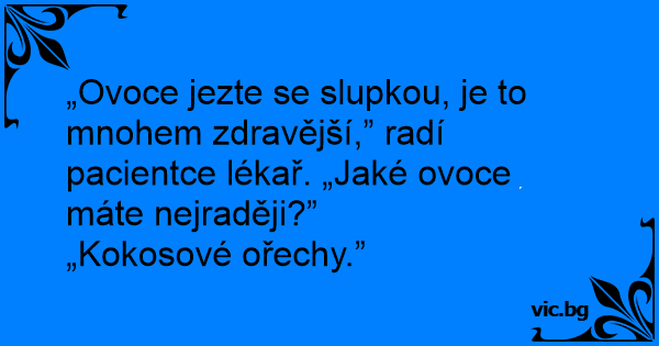 „Ovoce jezte se slupkou, je to mnohem zdravější,” radí pacientce lékař. „Jaké ovoce máte nejraději?”