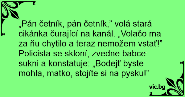 Policista se skloní, zvedne babce sukni a konstatuje: „Bodejť byste mohla, matko, stojíte si na pysku!”