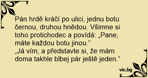 Pán hrdě kráčí po ulici, jednu botu černou, druhou hnědou. Všimne si toho protichodec a povídá: „Pane, máte každou botu jinou.”