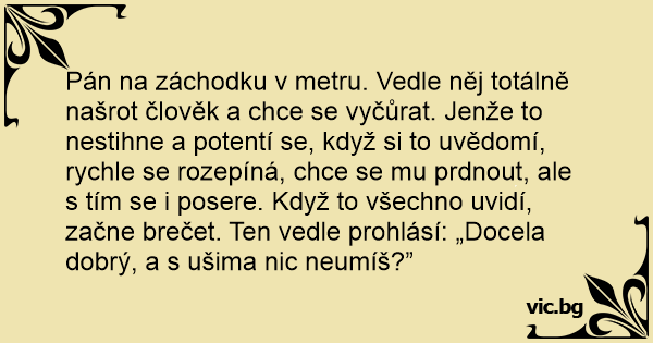 Pán na záchodku v metru. Vedle něj totálně našrot člověk a chce se vyčůrat. Jenže to nestihne a potentí se, když si to uvědomí, rychle se rozepíná, chce se mu prdnout, ale s tím se i posere. Když to všechno uvidí, začne brečet. Ten vedle prohlásí: „Docela dobrý, a s ušima nic neumíš?”