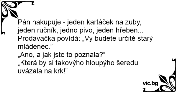 Pán nakupuje - jeden kartáček na zuby, jeden ručník, jedno pivo, jeden hřeben... Prodavačka povídá: „Vy budete určitě starý mládenec.”