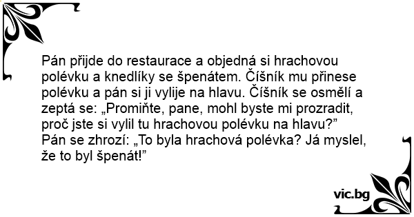 Pán přijde do restaurace a objedná si hrachovou polévku a knedlíky se špenátem. Číšník mu přinese polévku a pán si ji vylije na hlavu. Číšník se osmělí a zeptá se: „Promiňte, pane, mohl byste mi prozradit, proč jste si vylil tu hrachovou polévku na hlavu?”
