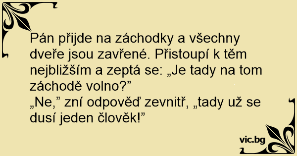 Pán přijde na záchodky a všechny dveře jsou zavřené. Přistoupí k těm nejbližším a zeptá se: „Je tady na tom záchodě volno?”