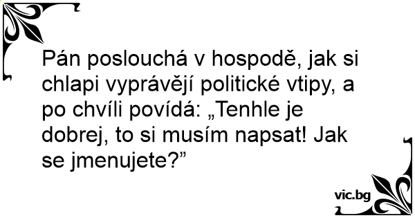 Pán poslouchá v hospodě, jak si chlapi vyprávějí politické vtipy, a po chvíli povídá: „Tenhle je dobrej, to si musím napsat! Jak se jmenujete?”