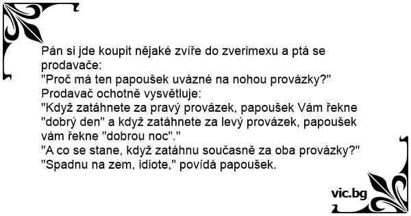 "Když zatáhnete za pravý provázek, papoušek Vám řekne "dobrý den" a když zatáhnete za levý provázek, papoušek vám řekne "dobrou noc"."