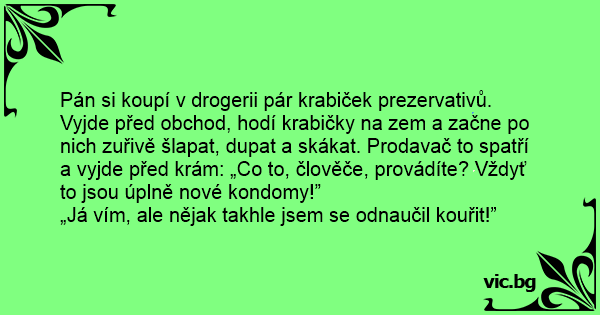 Pán si koupí v drogerii pár krabiček prezervativů. Vyjde před obchod, hodí krabičky na zem a začne po nich zuřivě šlapat, dupat a skákat. Prodavač to spatří a vyjde před krám: „Co to, člověče, provádíte? Vždyť to jsou úplně nové kondomy!”