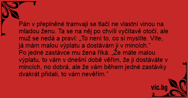 Pán v přeplněné tramvaji se tlačí ne vlastní vinou na mladou ženu. Ta se na něj po chvíli vyčítavě otočí, ale muž se nedá a praví: „To není to, co si myslíte. Víte, já mám malou výplatu a dostávám ji v mincích.”