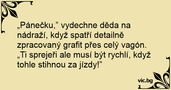„Pánečku,” vydechne děda na nádraží, když spatří detailně zpracovaný grafit přes celý vagón. „Ti sprejeři ale musí být rychlí, když tohle stihnou za jízdy!”