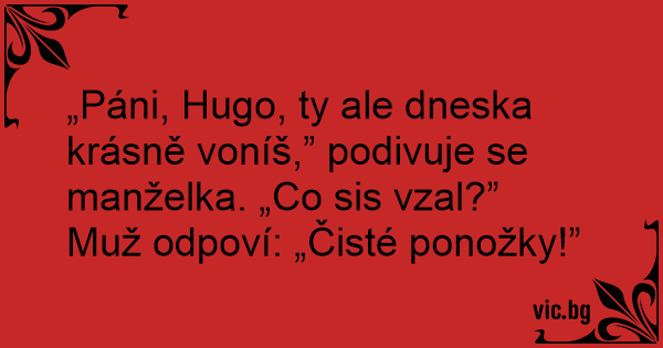 „Páni, Hugo, ty ale dneska krásně voníš,” podivuje se manželka. „Co sis vzal?”
