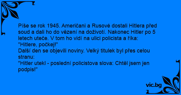 Píše se rok 1945. Američani a Rusové dostali Hitlera před soud a dali hо do vězení na doživotí. Nakonec Нiтlеr po 5 letech uteče. V tom hо vidí na ulici policista a říka: