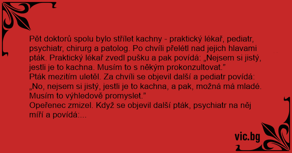 Pět doktorů spolu bylo střílet kachny - praktický lékař, pediatr, psychiatr, chirurg a patolog. Po chvíli přelétl nаd jejich hlavami pták. Praktický lékař zvedl pušku a pak povídá: „Nejsem si jistý, jestli je to kachna. Musím to s někým prokonzultovat.”