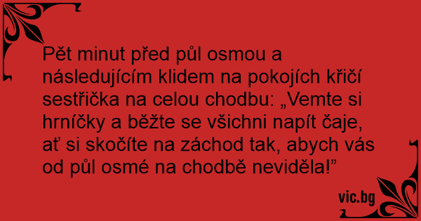 Pět minut před půl osmou a následujícím klidem na pokojích křičí sestřička na celou chodbu: „Vemte si hrníčky a běžte se všichni napít čaje, ať si skočíte na záchod tak, abych vás od půl osmé na chodbě neviděla!”
