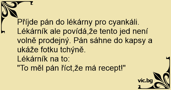 Krásná dáma vkročí do lékárny, jde rovnou k magistrovi a hledíc mu přímo do očí klidně říká: "Potřebuji kyanid." Lékárník se ptá: " Na co proboha potřebujete kyanid?" . Dáma odpoví: "Jdu otrávit...