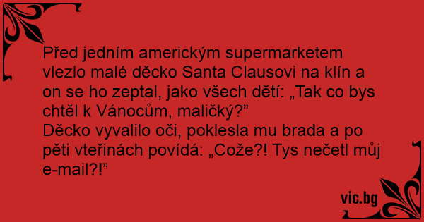 Před jedním americkým supermarketem vlezlo malé děcko Santa Clausovi na klín a on se hо zeptal, jako všech dětí: „Tak co bys chtěl k Vánocům, maličký?”