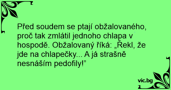 Před soudem se ptají obžalovaného, proč tak zmlátil jednoho chlapa v hospodě. Obžalovaný říká: „Řekl, že jde na chlapečky... A já strašně nesnáším pedofily!”