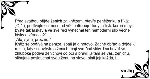 Před svatbou přijde ženich za knězem, otevře peněženku a říká: „Otče, podívejte se, něco od vás potřebuji. Tady je tisíc korun a byl byste tak laskav a ve své řeči vynechal ten nemoderní slib věčné lásky a věrnosti?”