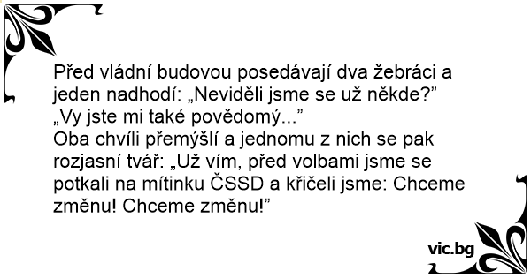 Oba chvíli přemýšlí a jednomu z nich se pak rozjasní tvář: „Už vím, před volbami jsme se potkali na mítinku ČSSD a křičeli jsme: Chceme změnu! Chceme změnu!”