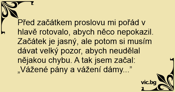 Před začátkem proslovu mi pořád v hlavě rotovalo, abych něco nepokazil. Začátek je jasný, ale potom si musím dávat velký pozor, abych neudělal nějakou chybu. A tak jsem začal: „Vážené pány a vážení dámy...”