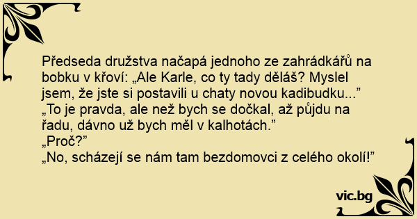 Předseda družstva načapá jednoho ze zahrádkářů na bobku v křoví: „Ale Karle, co ty tady děláš? Myslel jsem, že jste si postavili u chaty novou kadibudku...”