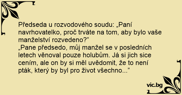 „Pane předsedo, můj manžel se v posledních letech věnoval pouze holubům. Já si jich sice cením, ale on by si měl uvědomit, že to není pták, který by byl pro život všechno...”