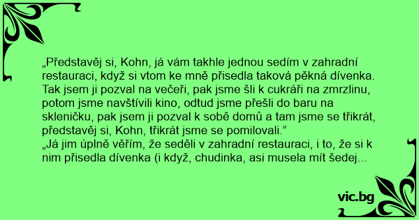 „Představěj si, Kohn, já vám takhle jednou sedím v zahradní restauraci, když si vtom ke mně přisedla taková pěkná dívenka. Tak jsem ji pozval na večeři, pak jsme šli k cukráři na zmrzlinu, potom jsme navštívili kino, odtud jsme přešli do baru na skleničku, pak jsem ji pozval k sobě domů a tam jsme se třikrát, představěj si, Kohn, třikrát jsme se pomilovali.”
