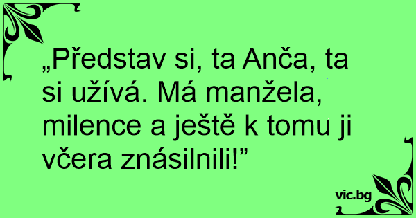 „Představ si, ta Anča, ta si užívá. Má manžela, milence a ještě k tomu ji včera znásilnili!”