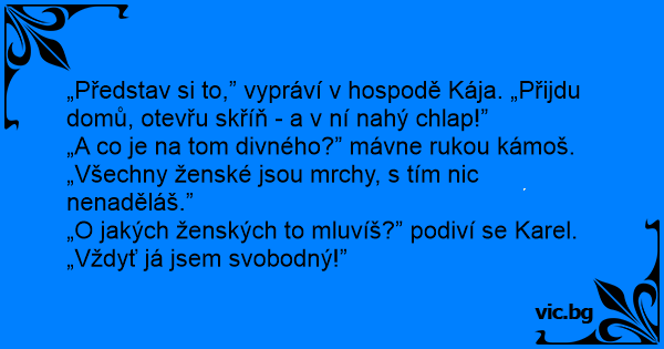 „Představ si to,” vypráví v hospodě Kája. „Přijdu domů, otevřu skříň - a v ní nahý chlap!”