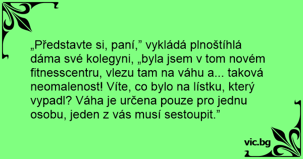 „Představte si, paní,” vykládá plnoštíhlá dáma své kolegyni, „byla jsem v tom novém fitnesscentru, vlezu tam na váhu a... taková neomalenost! Víte, co bylo na lístku, který vypadl? Váha je určena pouze pro jednu osobu, jeden z vás musí sestoupit.”