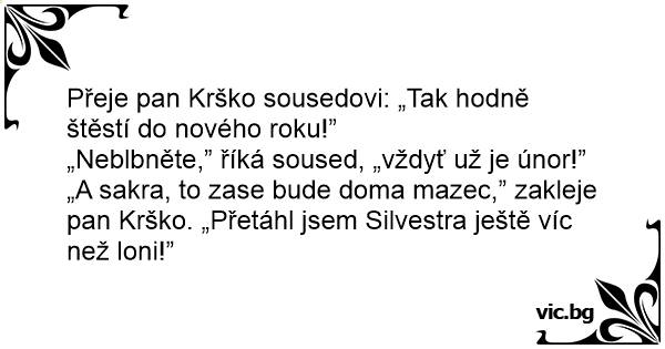 „A sakra, to zase bude doma mazec,” zakleje pan Krško. „Přetáhl jsem Silvestra ještě víc než loni!”