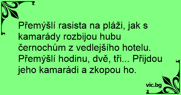 Přemýšlí rasista na pláži, jak s kamarády rozbijou hubu černochům z vedlejšího hotelu. Přemýšlí hodinu, dvě, tři... Přijdou jeho kamarádi a zkopou hо.
